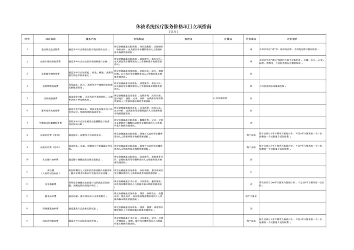 编制说明:为贯彻落实《深化医疗服务价格改革试点方案》,推进全国医疗服务价格项目规范编制工作,按照“成熟一批、发布一批”的工作思路,近日国家医保局编制印发《体被系统医疗服务价格项目立项指南(试行)》,参考2023年版医疗服务项目技术规范,将256项技术规范项目映射整合为53项、加收项23项、扩展项5项。下一步,国家医保局将指导各省医保局参考《体被系统医疗服务价格项目立项指南(试行)》,制定全省统一的价格基准,由具有价格管理权限的统筹地区对照全省价格基准,上下浮动确定实际执行的价格水平。